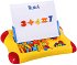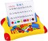 Барт”! То носи ценен багаж в себе си, който значително ще увеличи познанията на всяко дете. В него са скрити двустранна магнитна дъска за писане и рисуване, 50 цветни, магнитни буквички, 20 магнитни цифри и 6 знака, флумастер, гъба за изтриване и 2 държача. С всички тези формички и елементи, ще може да проведете първите си уроци по български и математика, да се позабавлявате рисувайки, и да оставите своето специално послание на мама и тати. Забавният урок започва с подготвянето на дъската. След като я отделите от куфара, поставете държачите на специалните за това места и я подпрете върху тях. Следвайте примерните буквички, написани между широките и тесни редове, опитайте се да ги повторите върху дъската с флумастера и намерете техните близначета сред купчинката от магнитни букви. Помолете родителите си да ви запознаят и с цифрите и след като урокът приключи, обърнете дъската от другата страна и рисувайте колкото искате.