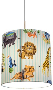 Детската лампа е ръчно изработена и има весел десен с животни, подходящ както за момичета, така и за момчета. Величествен лъв, жираф и весели маймунки се разхождат във всички посоки и любопитно наблюдават. Пенделът (кабелът) е с дължина 70 cm, а абажурът е с размери 30 / 30 / 30 cm.
