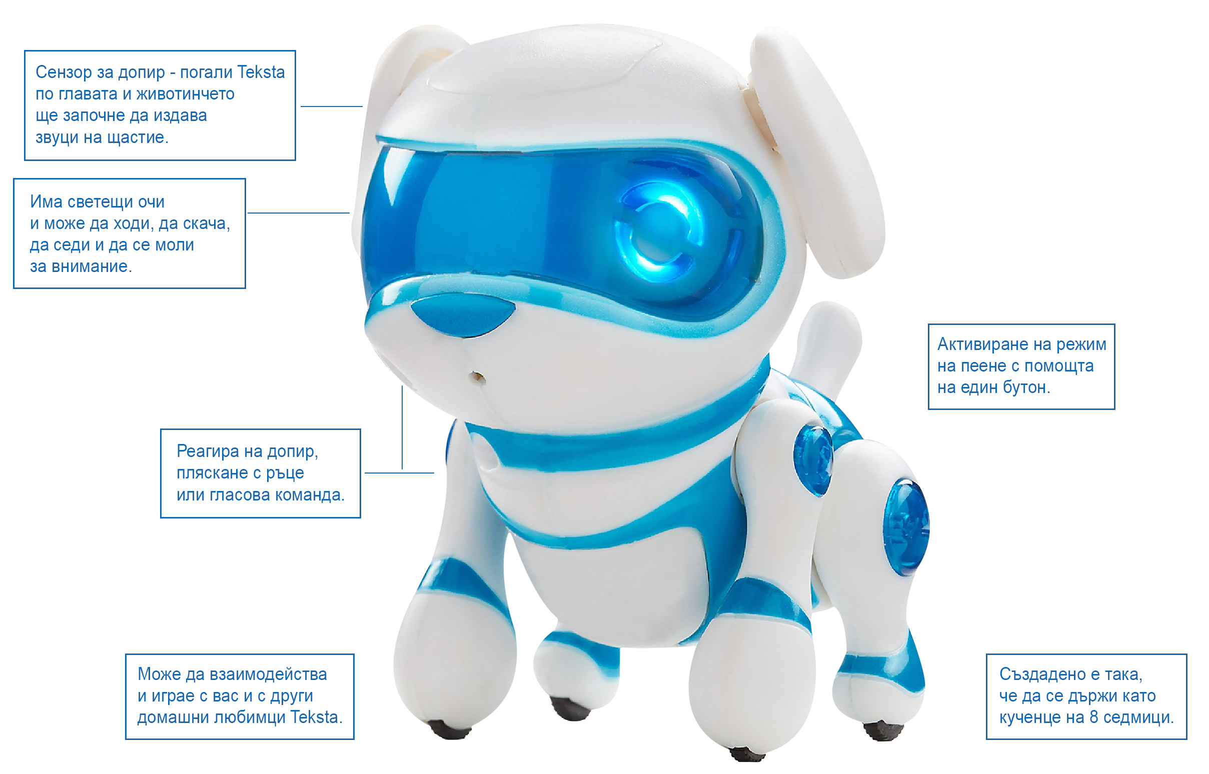 Интерактивното животинче пристига с изразителни светещи очи (които могат да примигват или да променят яркостта и силата на светенето си), но определено ще привлече детското внимание с държанието си. Роботизираният домашен любимец има реакции и изпълнява команди - детето лесно може да го "програмира" да ходи, да седи, да търси внимание, да скача в ръката на стопанина си и дори да изпее 2 песнички на кучешки език. За целта малчуганът просто трябва да сменя позицията на предните лапички на кучето и да използва двата бутона на главата на Teksta. С единия се активира режимът на скачане, а с другия - режимът за песничките. И в двата случая обаче, за да бъде активирането успешно, е нужно детето да държи бутонът продължително, докато не чуе звуков сигнал - тогава може да започне с командите.