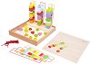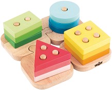 От "Woodyland" са произвели страхотна играчка, която ще развие логиката, фината моторика, координацията и сръчността на вашия малчуган. Комплектът представлява дървен пъзел, познат още като "низанка", върху чиито отделни елементи вашият малчуган трябва да наниже съответната геометрична фигурка. Играчката се състои от 3 квадратчета, 3 триъгълника, 3 правоъгълника и 3 кръгчета, а основата е съставена от пъзел с 4 части. Компонентите са с различни цветове и различни нюанси.