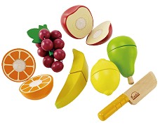 Всички малки деца трябва да обичат плодове... Пресните плодове дават на децата сладък вкус и изобилие от витамини. Плодовете могат да се разрежат с помощта на нож. Различните елементи се залепят с велкро лента и могат да се режат многократно. Играчката е боядисана с безвредни бои.