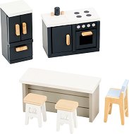 Дървените мебели Модерна кухня от Lelin Toys са подходящи за ролеви игри и за обзавеждане на дървени къщи за кукли. Комплектът съдържа 6 части - печка, мивка, хладилник, кухненски остров и три стола. Всеки елемент е детайлно изработен, за да наподобява истинска кухня в мини размер. Мебелите са направени от висококачествено и екологично дърво, боядисани с безопасни, нетоксични бои на водна основа. Повърхностите са гладки и без остри ръбове. Цветовата гама е в меки пастелни нюанси, което придава реалистичен и модерен вид. Играта насърчава въображението, социалните умения, логическото мислене и координацията между ръцете и ... |