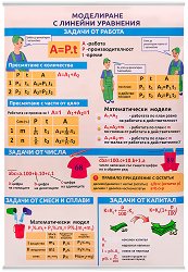 Учебното табло е ламинирано, с лайсни и въже за закачане. Таблото е с размери 70 x 100 cm. Таблото по математика онагледява следните типове текстови задачи: пред учениците е формулата, таблицата и основните математически модели при пресмятане с количества и с части от цяло; задачи от смеси и сплави: бързо и лесно с помощта на таблицата и математическия модел учителят ще обяснява, а ученикът ще решава задачите и от този тип; задачи от числа и задачи от капитал: с подходяща илюстрация и точната формула и тези типове задачи ще станат лесни за усвояване от учащите. ... |