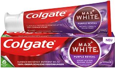 Пастата за зъби Purple Reveal от Colgate почиства зъбите и устната кухина, като едновременно с това предпазва от кариеси. Тя има незабавен* избелващ ефект и осигурява видимо по-бяла усмивка. Благодарение на своята иновативна формула и лилавия си цвят, пастата елиминира жълтите тонове и премахва до 100%* от повърхностните петна. Формулата на пастата съдържа флуорид, който заздравява зъбите, укрепва емайла и предпазва от появата на кариеси. Пастата за зъби Colgate Max White е безопасна за емайла и е подходяща за ежедневна употреба. * Според производителя. ...