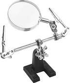 Помощната стойка на Tolsen е предназначена за работа с поялници и е подходяща както при ремонт на платки и часовници, така и при изработване на бижута и други дейности изискващи висока прецизност. Разполага със стоманена основа, осигуряваща стабилност, а щипките ѝ могат да бъдат регулирани. Стойката е оборудвана с лупа, която може да се завърта на 360°, има до 3x увеличение и е с диаметър ∅ 62 mm. ...