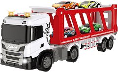 Този впечатляващ камион Scania от Ocie е създаден, за да предложи часове забавна и въображаема игра. Моделът разполага с функционална транспортна платформа със спускаща се задна рампа, която позволява лесно качване и слизане на малките автомобили. Издърпващите се опори осигуряват стабилност на ремаркето и позволяват то да стои отделно от кабината на водача, което прави играта още по-реалистична. Комплектът включва 4 малки колички, които детето може да превозва с камиона или да използва самостоятелно в различни игрови сценарии. Благодарение на множеството подвижни елементи, играчката стимулира въображението, ролевата ... |