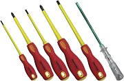 Комплектът на Tolsen се състои от 5 плоски (SL) и 2 кръстати (PH) отвертки. Инструментите са изработени от S2 закалена стомана и имат ергономични двукомпонентни ръкохватки за удобство по време на работа. Отвертките са с дължина 50 mm и разполагат с VDE, GS и EN60900 сертификати за работа с напрежение до 1000 V. Вид на отвертките: плоски SB1.5 SB1.8 SB2 SB2.5 SB3 кръстати PH1 PH2 ... |