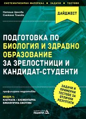 За отлични резултати на матурата и кандидатстудентските изпити. Самоучителят по биология и здравно образование (за общообразователна подготовка) съдържа систематизирани и обобщени знания по учебния предмет в първи гимназиален етап (8. клас, 9. клас, 10. клас). Помагалото e предназначено за: зрелостници, които са избрали като матуритетен предмет биология и здравно образование (общообразователна подготовка); кандидат-студенти за успешното им представяне на конкурсните изпити по биология; ученици, които се подготвят за участие в олимпиади и състезания по биология; всички ученици от 8. клас, 9. клас, 10. клас ... |