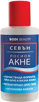 Лосионът "Севън" от "Bodi Beauty" e специално предназначен за склонна към акне кожа. Той има противовъзпалителен и антибактериален ефект, благодарение на екстракта от розмарин във формулата. Добавен е и камфор, който спомага премахването на излишния себум и нормализира омазняването на кожата. Лосионът съдържа и алантоин за укрепване и регенериране на защитните функции на кожата. За успокояването на раздразненията се грижи добавената урея. Характеристики: формула с растителни масла и екстракти с антибактериално и почистващо действие подходящ за мазна и склонна към акне кожа почистваща ... |