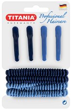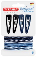 Комплект аксесоари за коса от "Titania", който включва 4 щипки и 4 ластика за коса във свежи сини цветове. Щипките са с дължина 4.5 cm и са със зъбчета от вътрешната страна, за да осигурят стабилно закрепване. Съчетани с ластиците за коса в същата цветова гама, те са перфектни за оформяне и фиксиране на желаната прическа. ...