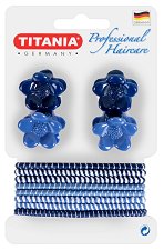 Комплект аксесоари за коса от "Titania", който включва 4 малки щипки във формата на красиво цвете и цял "арсенал" от ластици за коса със свежи сини цветове. Щипките са със размер 2.5 cm и с механизъм за стабилно захващане. Съчетани с ластиците за коса в същата цветова гама, те са перфектни за оформяне и фиксиране на желаната прическа. ...