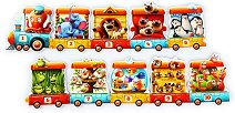 С образователния пъзел вашето дете ще може да научи числата и животните по един забавен начин. Той се състои от 20 елемента, които при сглобяването образуват локомотив и вагони. Всяка част от влакчето се състои от 2 елемента, които детето ще трябва да подреди правилно. Така докато реди, малчугана ще се научи да брои от 1 до 10, както и да различава животните. Сглобеният пъзел е с приблизителни размери 94 x 12 cm. ...