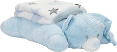 Комплектът Poffy на Lorelli се състои от бебешко одеяло и плюшена възглавничка. Одеялцето е изработено от много мека и приятна на допир 100% полиестерна материя и е с размери 70 x 95 cm. С него може да завивате новороденото в креватчето или в количката при ежедневните разходки. А с плюшеното мече-възглавничка детето може да си играе или да я гушка в леглото. Комплектът е опакован в стилна кутия, която му придава вид, подходящ за подарък. Приблизителната размери на възглавничката са 30 x 45 cm. ... |