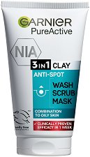 Pure Active 3 in 1 е перфектния продукт от Garnier за цялостно почистване на лицето. Той може да се използва като измиващ гел, скраб и маска и е специално разработен за комбинирана към мазна кожа. Формулата е обогатена с глина и ниацинамид (витамин B3), които намаляват несъвършенствата и разширените пори. Ниацинамидът помага за изравняване тена и текстурата на кожата. След употреба, нечистотиите са отстранени и кожата изглежда чиста, свежа и сияйна. Действия на Garnier Pure Active Clay: почиства - премахва замърсяванията и бактериите, благодарение на салициловата киселина, която има антибактериално действие ... |