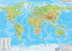 Съдържа: географска мрежа; държави, представени чрез фоново оцветяване и държавни граници; хидрография; столици; основни градове, надписи на хидрографията, знамена на държавите и други; легенда. Картата е с размер: 100 x 70 cm. Подходяща е за дълготрайна употреба. Изработена е за добра четимост от далечно разстояние. Картата е тествана сред 85 ученика, като са взети предвид препоръките относно четене, разпознаване на елементи и правилна съпоставка на показаната информация. Картата е с метални лайсни, на горната лайсна има две дупки за окачване на картата на стена. ... |