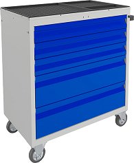 Количката от серията WDS на Практик е подходяща за съхранение на инструменти, аксесоари и други работни принадлежности в производствени предприятия, автосервизи и работилници. Рамката ѝ е изработена от прахово боядисана стомана с дебелина 0.15 cm и има 5 чекмеджета с централно заключване с ключ: 2 с вътрешен размер 65.5 / 17 / 40 cm и 3 с вътрешен размер 65.5 / 7.5 / 40 cm. Снабдена е с ергономична дръжка, а горният ѝ рафт е оборудван с гумирана противоплъзгаща подложка, която е устойчива на мазнини. Също така за лесно транспортиране разполага с 2 фиксирани и 2 подвижни колела с диаметър ∅ 10 cm. ... |
