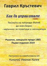 Ръкопис, завършен преди 1865 г. Преписана на новобългарски от Николай Иванов Колев. Първо издание 2019. ... "Драги читателя, Патриарх Фотий изпраща на княз Борис във втората част на своето писмо едно изключително интересно нравствено послание. Изхождайки от християнските норми, той вплита в писмото си и резултатите от своята изключителна наблюдателност и житейска мъдрост и в края на краищата писмото съдържа напътствия за такова поведение на управляващия, което е в интерес и за благото на управляваните, като ясно изтъква ползите от това за управляващия. В това писмо виждаме Фотий не само като брилянтен оратор, но и ...