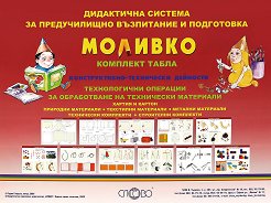 Табло за детската градина за деца на 6-7 години. ... Таблото Моливко съдържа теми за технологични операции за обработване на технически материали: Хартия и картон Природни материали Текстилни материали Метални материали Технически комплекти Строителни комплекти Размерите на таблото са: 46.7 x 34.2 cm. Дидактичната система Моливко за подготвителна група се състои от: помагало Обичам те, българска реч помагало В страната на математиката помагало Родна реч помагало С Моливко в страната Логика помагало С Моливко играй и мисли помагало Прозорче към света помагало От земята до небето помагало ...