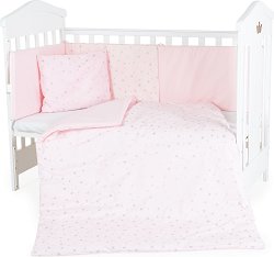 Спалният комплект на Kikka Boo съчетава в себе си стилен десен с ефектни декорации и високо качество на изработка и материи. С него без усилие ще превърнете креватчето на вашето бебе в уютно място за сън и игри. Комплектът се състои от възглавница, долен чаршаф с ластик, олекотена завивка, плик за олекотена завивка с цип и малък обиколник. Обиколникът е със свалящ се калъф с цип и е лесен за закрепване към предпазните решетки на детското креватче, за да обгърне част от вътрешността на леглото и да предпази бебето ви от евентуален удар в решетките. Спалният комплект е изработен от висококачествен 100% памучен ранфорс. ... |