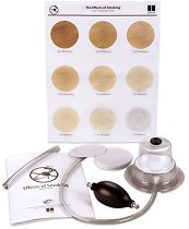 Комплектът е полезен учебен инструмент, който демонстрира по визуален и измерим начин количеството катран и никотин, произведени от цигарите при пушене. С помощта на високоефективен филтър от фибростъкло димът се "вдишва" през него и катраните и никотинът се събират върху филтъра, което позволява те да бъдат видени и анализирани. Учениците от по-горните класове могат да използват комплекта и за по-сложен химически анализ на събраните катрани, като по този начин развиват не само знания за вредите от тютюнопушенето, но и умения по химия и аналитика. В комплекта са включени 25 филтъра, формован пластмасов капак ( ... |
