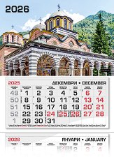 Характеристики на календара: 3 тела от 12 листа - на всеки лист по 1 месец (основен, предходен и предстоящ месец); фази на луната; имени дни; църковни празници; официални празници; съкращения на държавите, които честват свой празник на дадената дата; прозорче с ластици. ... |