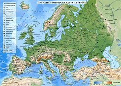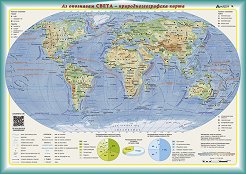 Двустранна ученическа карта. ... Характеристики на картата: Размери на картата 29.5 х 21 cm. Мащаб на природогеографската карта на Европа: 1:22 000 000 Мащаб на политическата карта на Света: 1:168 000 Картата включва: залежи на полезни изкопаеми: горивни, рудни и нерудни; най-големи държави по площ; население на света; най-голями градове и агломерации в света; списък на държавите по континенти (с номерация). ...
