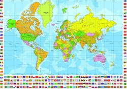 Сгъваема карта тип дипляна. Размер при разгънат формат: 70 x 100 cm. В картата ще откриете информация за: най-актуалната политическа карта на света; държави, столици, градове; знамена; допълнителна информация. ...