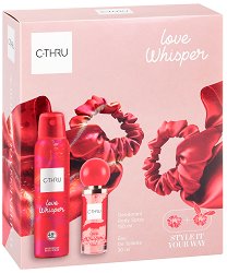 Комплектът Love Whisper от C-Thru съдържа дамски парфюм, дезодорант и две скрънчита с красив дизайн. Те са опаковани в красива кутия, готова за подарък. Дезодорантът неутрализира неприятните миризми и доставя дълготрайно усещане за свежест, а парфюмът обгръща тялото с женствено ухание. Неустоимият плодово-флорален аромат на парфюма Love Whisper завладява сетивата. Той се разкрива с върхови нотки касис, круша и розов пипер. Продължава с опияняващо сърце от хелиотроп, роза и жасмин. Базата от ванилия и кедрово дърво, гали сетивата и придава топлина на аромата. Парфюмът Love Whisper е предназначен за смелите, пламенни и ... |