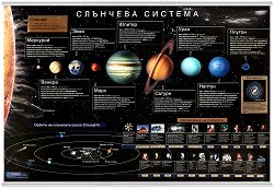 Учебното табло "Слънчева система" е ламинирано, с лайсни и въже за закачане. Таблото е с размери 100 x 70 cm. На него е изобразена Слънчевата система, която включва информация за планетите, орбитите на планетите около Слънцето, както и хронология на откритията свързани с космоса (включително участието на България). ... |