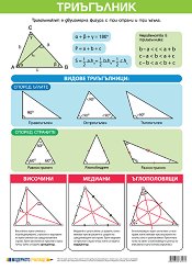 Учебното табло "Триъгълник" е ламинирано, с лайсни и въже за закачане. Таблото е с размери 70 x 100 cm и е двустранно. Учебното табло съдържа информация за: видове триъгълници; височини; медиани; ъглополовящи. ...