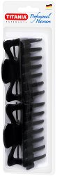 Комплектът щипки за коса от немската компания "Titania" се състои от 2 големи елегантни черни щипки. Всяка има по 14 зъбци в долната си част (7 от едната и 7 от другата страна), което ги прави стабилни при захващане на косата. Щипките са с дължина 6.5 cm. Подходящи са за връзване на цялата коса в практична и удобна опашка. ... |