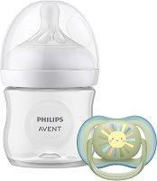 Комплектът от серията Natural Response на Philips Avent включва шише, биберон и залъгалка. Шишето е изработено от полипропилен, а вместимостта му е 125 ml. То е с форма, която дава възможност за лесно захващане и максимален комфорт на вашето дете. Неговото широко гърло и наличието на малко части правят почистването му лесно. Към шишето е включен и силиконов биберон за бебета от 0+ месеца с поток на течността 2 капки. Биберонът е вдъхновен от физиологията на майките и бебетата, и подпомага индивидуалният ритъм на хранене на бебето. Той освобождава мляко, само когато бебето пие активно, използвайки модела засмукване, ... |
