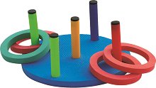 Ако търсите интересно забавление за вашето дете подходящо за двора или апартамента, то комплектът за игра с рингове е точно за вас. Основата и ринговете са изработени от EVA пяна, а колчетата са от пластмаса. Играта е подходяща за деца над 3-годишна възраст и в нея могат да участват до 4 -ма играчи. Целта на играта е ринговете да се хвърлят и да се уцели някое от колчетата. Колчетата са с височина 20 cm. Диаметъра на ринговете е 15 cm. ...