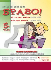 Изходно ниво за 1. клас, входно ниво за 2. клас. Езикови задачи със свободни отговори. Езикови задачи със избираеми отговори. Този сборник за 1. клас е създаден по молба на преподаватели в начална образователна степен. Сборникът съдържа само оригинални авторски текстове, написани с доказан творчески и методически професионализъм от Наталия Огнянова. Сборник Браво! е разработен за 1. клас в 5 части: За първи клас системата съдържа над 900 богати илюстровани задачи и подзадачи за самостоятелни практически упражнения в буквения и следбуквения период на обучение: самоподготовки, задачи за звуков и буквен анализ, граматични ... |