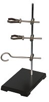 Стативът с кръгъл борд представлява стабилна метална конструкция, предназначена за лабораторна работа със спиртна лампа или Бунзенова горелка. Той служи като основа за нагряване на съдове като колби, мензури или епруветки по време на експерименти. Стативът е с височина 14 cm и диаметър на кръглия борд е 8 cm. Изработен е от издръжлив метал, който гарантира стабилност и безопасност при работа с открит пламък. Обикновено върху статива се поставя метална мрежа с керамична плочка, която осигурява равномерно разпределение на топлината и предпазва стъклените съдове от директен контакт с огъня. ... |