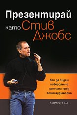 Как да бъдем невероятно успешни пред всяка аудитория. ... Милиони хора по света са гледали и гледат презентациите на Стив Джобс. Мнозина твърдят, че Стив Джобс е най-добрият презентатор в света на бизнеса. Всеки, за когото презентирането е част от работата му, се е замислял как да направи следващата си презентация по-въздействаща. Сега ще ни е по-лесно, защото в „Презентирай като Стив Джобс“ сякаш самият майстор на презентациите ни нашепва своите тайни. Специалистът по комуникации Кармайн Гало е изучил и анализирал най-добрите презентации на Джобс, като е извлякъл от тях страхотни примери, техники и тайни, които могат ... |