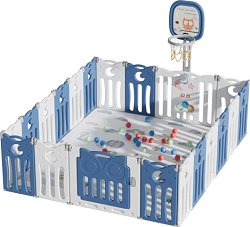 Детската кошара Owl на Sonne осигурява сигурност и комфорт на вашето дете по време на игра. Тя е изработена от висококачествена пластмаса, която отговаря на всички европейски изисквания за безопасност и качество на детските продукти. Кошарата е със заоблени ръбове за безопасност, сгъваема е и е с регулируема форма. Тя се състои от 20 панела и е достатъчно голяма, за да може вашето дете да играе свободно в нея. А чрез използването на различен брой панели може да променяте формата ѝ или да създадете различно по размер пространство за игра. Освен това тя разполага с баскетболен кош с топка, който е предназначен да ... |