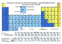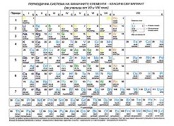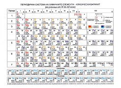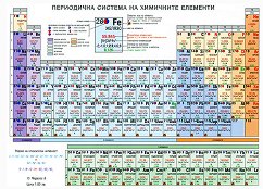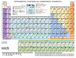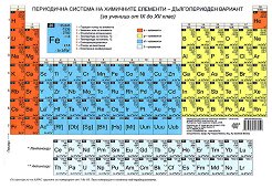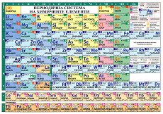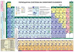 Таблицата съдържа: химични знаци; атомни номера; относителна атомна маса; електронна конфигурация; възможни степени на окисление; най-характерна степен на окисление (болд); агрегатно състояние при нормални условия; радиоактивни свойства; киселинно-основни свойства на висшия оксид; атомен и йоннен (катионен или анионен) радиус; вандерваалсов радиус. Представена е допълнителна справочна информация за елементите - латинско наименование, температура на топене, температура на кипене, електроотрицателност, плътност, съдържание в земната кора, твърдост по Моос. Таблицата е двустранна, пълноцветна и е ... |