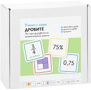 Комплектът е част от серията "Учене с игра", където ще откриете още образователни карти по темата. ... С образователния комплект от "Глобал" вашето мъниче ще научи повече за дробите. Той се състои от правила и 64 карти. Те са разделени на 4 вида - зелени с обикновени дроби, сини с десетични дроби, червени с картинки и жълти с проценти. С тях детето може да играе по 4 начини - мемо игри "Запомни процентите и дробите" и "Запомни значението на дробите", "Събери четири подред", "Война" и "Подреди по големина". Шрифтът "Adys", който е използван за ... |