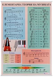 На таблото са представени основните понятия в музикалната теория - ключ, петолиние, синкоп и триола, трайности на нотите и паузите, метрум - равноделни и неравноделни размери, увеличения трайността на нотите и паузите. Таблото е с размери: 70 x 100 cm. ... |