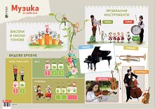Учебното табло е с две лица, изобразяващи елементарната теория на музиката. То е ламинирано, с лайсни и въже за закачане и е с размери 70 x 100 cm. На таблото са представени основните понятия в музикалната теория, а именно: ключ; петолиние; до мажор; разновидности на основните степени; трайности на тоновете и паузите; увеличение стойността на нотите; метрум: равноделни размери; неравноделни размери; лад; тоналности; темпо; интервали; динамика; метроном; камертон. ... |