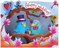 3D картичката на "Gespansterwald" е изработена от луксозен картон. Формите и фигурите са изрязани с лазер на 4 слоя, като последният е фон на картичката. На гърба има специално определено място за надписване. Тя е с изключително нежен и очарователен анимиран дизайн - птици младоженци, кацнали на дърво и надпис "Happy Wedding". Подходяща е за сватба или годишнина. Картичката може да бъде поставена в подаръчна торбичка или кутия. Тя е с размери 13.4 / 11 / 4 cm, с включен цветно отпечатан плик. ... |