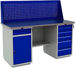 Масата от серията Profi W на Практик е предназначена за организиране на работното място и удобство в производство, гаражи, работилници и учебни заведения. Изработена е от здрава и стабилна стоманена конструкция. Има прахово боядисан корпус в сив цвят. Плотът ѝ е изработен от MDF материал, допълнен с поцинкован метален лист. Бюрото за работилница е снабдено с рафт за съхранение в средата, чекмедже и шкаф, които могат да се заключват и 5 чекмеджета с централно заключване. Максималното му натоварване е 300 kg. Масата може да бъде оборудвана с допълнителни аксесоари, които се закупуват отделно. Характеристики: ... |