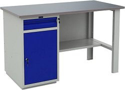 Масата на Практик от серията Profi W е предназначена за организиране на работното място в производствени помещения, гаражи, работилници и учебни заведения. Изработена е от здрава и стабилна стоманена конструкция, има прахово боядисан корпус, а плотът ѝ е от MDF материал, допълнен с поцинкован метален лист с дебелина 0.15 cm за допълнителна издръжливост. Също така е снабдена с рафт по средата, шкаф, който може да се заключва и 5 чекмеджета с централно заключване. Масата е с размери 180 / 87 / 70 cm и максимална товароносимост 300 kg. Масата може да бъде оборудвана с допълнителни аксесоари, които се закупуват ... |