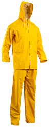 Работния дъждобран е комплект от яке и панталон с основа от памук и полиестер и двустранна PVC промазка, които осигуряват перфектна водонепропускливост. Комплектът е е шит и швайцван с двойно топло подлепени шевове. Якето е с качулка, пристегната с шнур, ластик от вътрешната страна на ръкавите и отвори за проветрение. Закопчаването е двойно с цип, покрит с пластрон, и тик-так копчета. Има 2 прави джоба с хоризонтални капаци. Панталонът от комплекта се пристяга ластично в талията, в крачолите се пристяга с тик-так копчета и има един джоб. Дебелина: 0.32 mm ... |