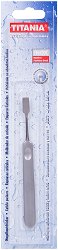 Инструментът за избутване на кожички, създаден от специалистите на "Titania", е изработен от висококачествена неръждаема стомана (инокс). Дизайнът му е разработен така, че захватът да бъде удобен и сигурен, без опасност от изплъзване. Широката му глава прави избутването на кожичките лесно, за да бъде маникюрът ви безупречен. Дължината на инструмента е 13 cm, а ширината на избутващата глава - 0.7 cm. Подходящ е за професионална употреба в салони, благодарение на устойчивия материал, от който е изработен. ... |